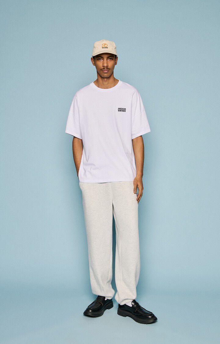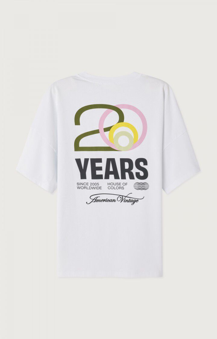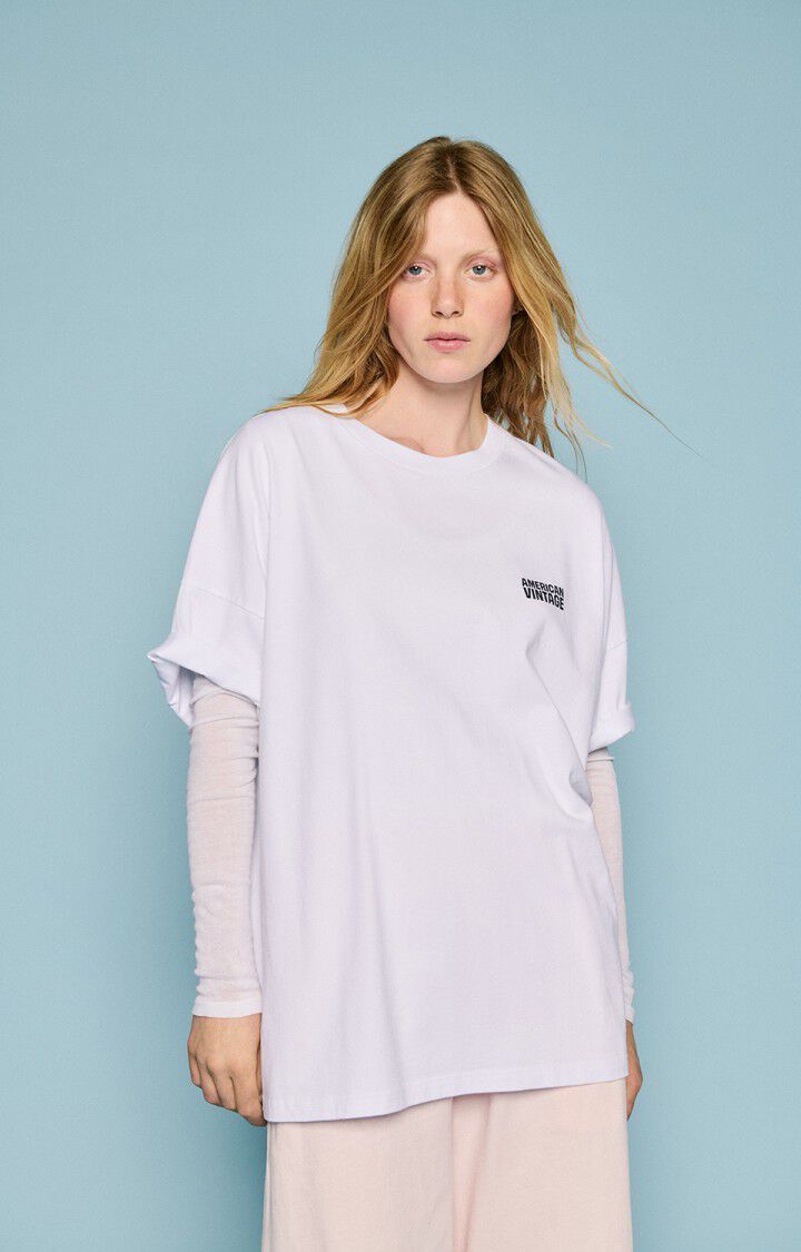La camiseta unisex Fizvalley blanca, icono de la marca, se reedita para celebrar los 20 años de American Vintage, con un corte ultra oversize. Este modelo emblemático es un imprescindible de la colección, confeccionado en algodón liso, grueso y compacto para un look auténtico y atemporal. Combinando a la perfección el estilo desenfadado y un fuerte ADN, se puede llevar tanto con una prenda de denim como con una de felpa.