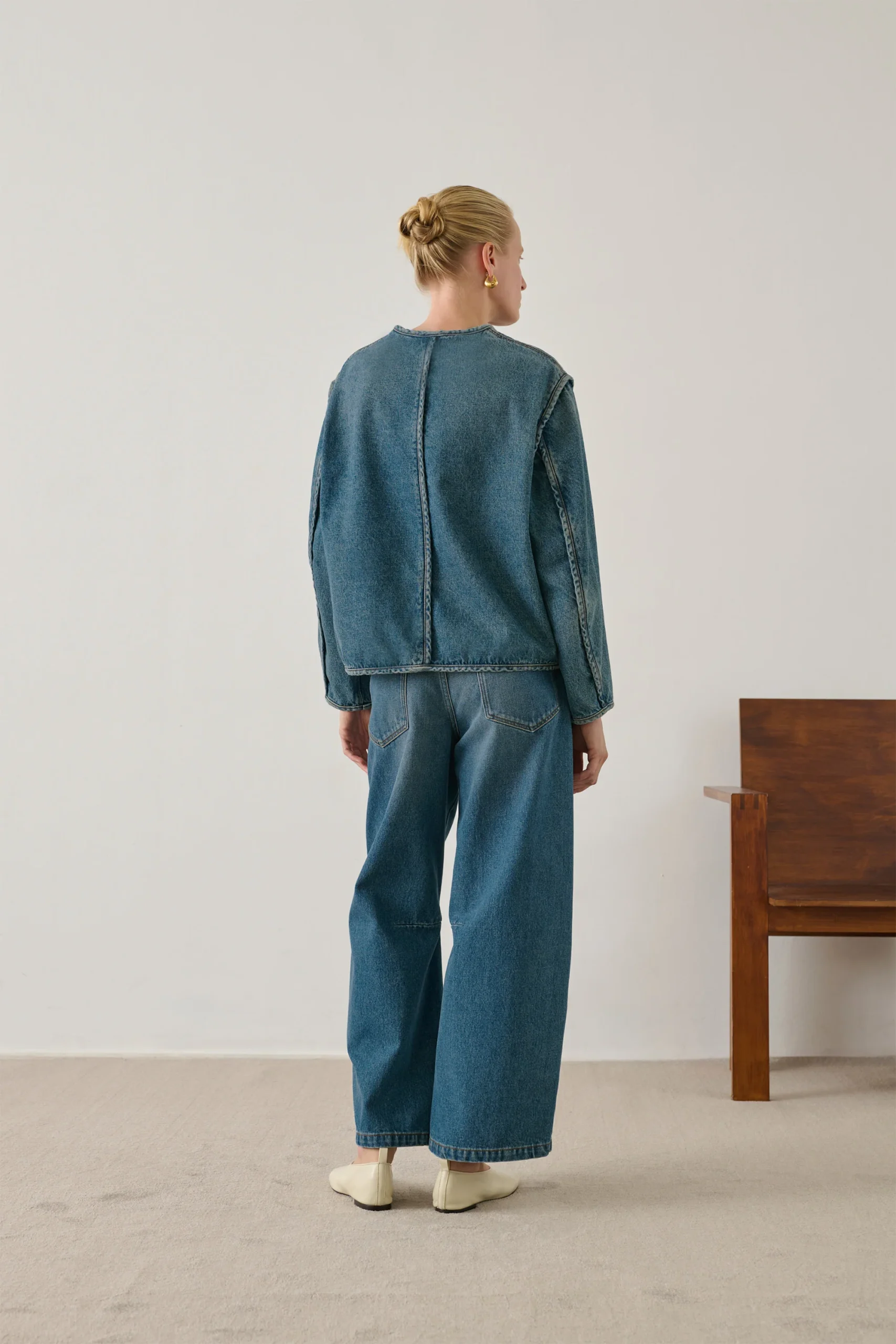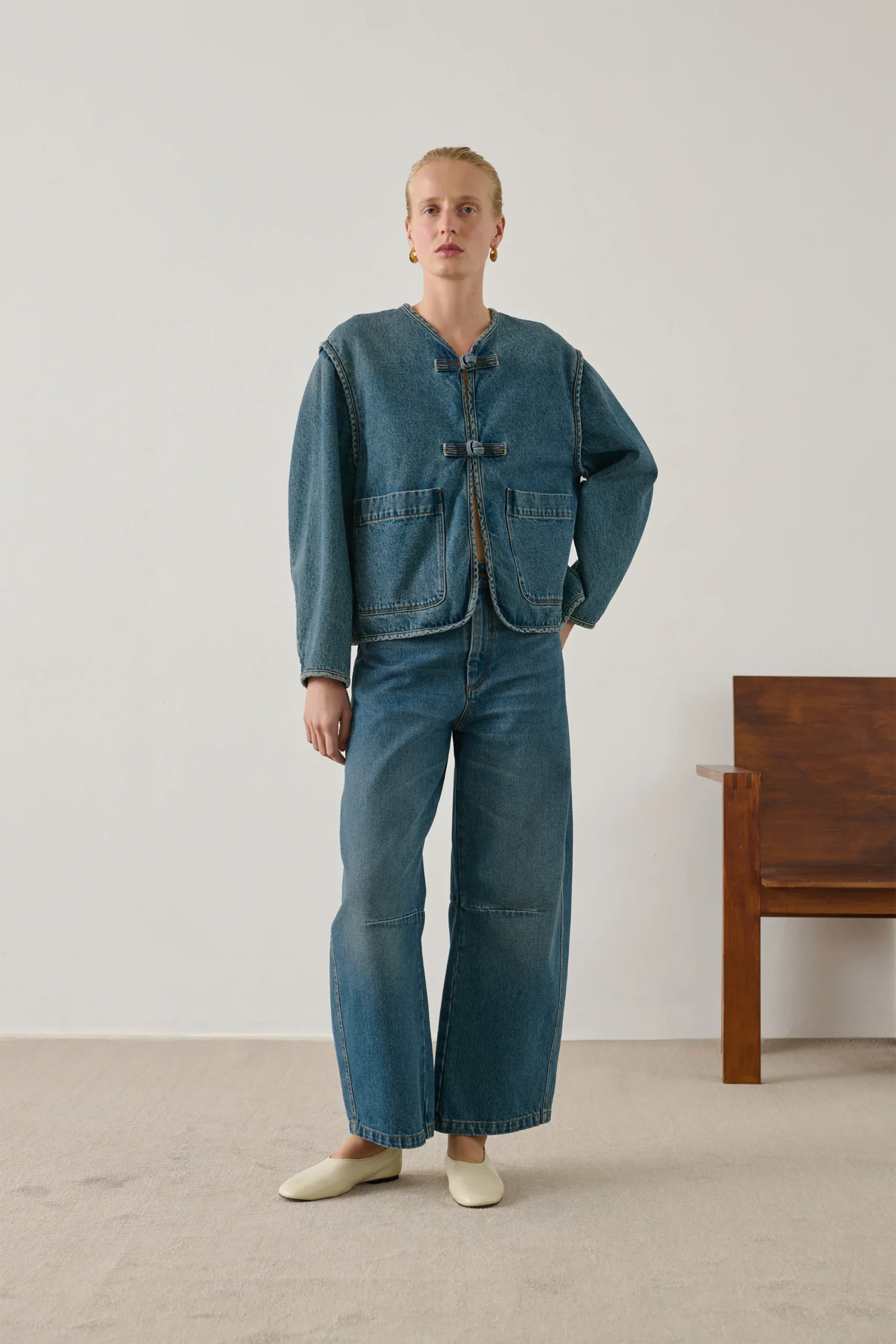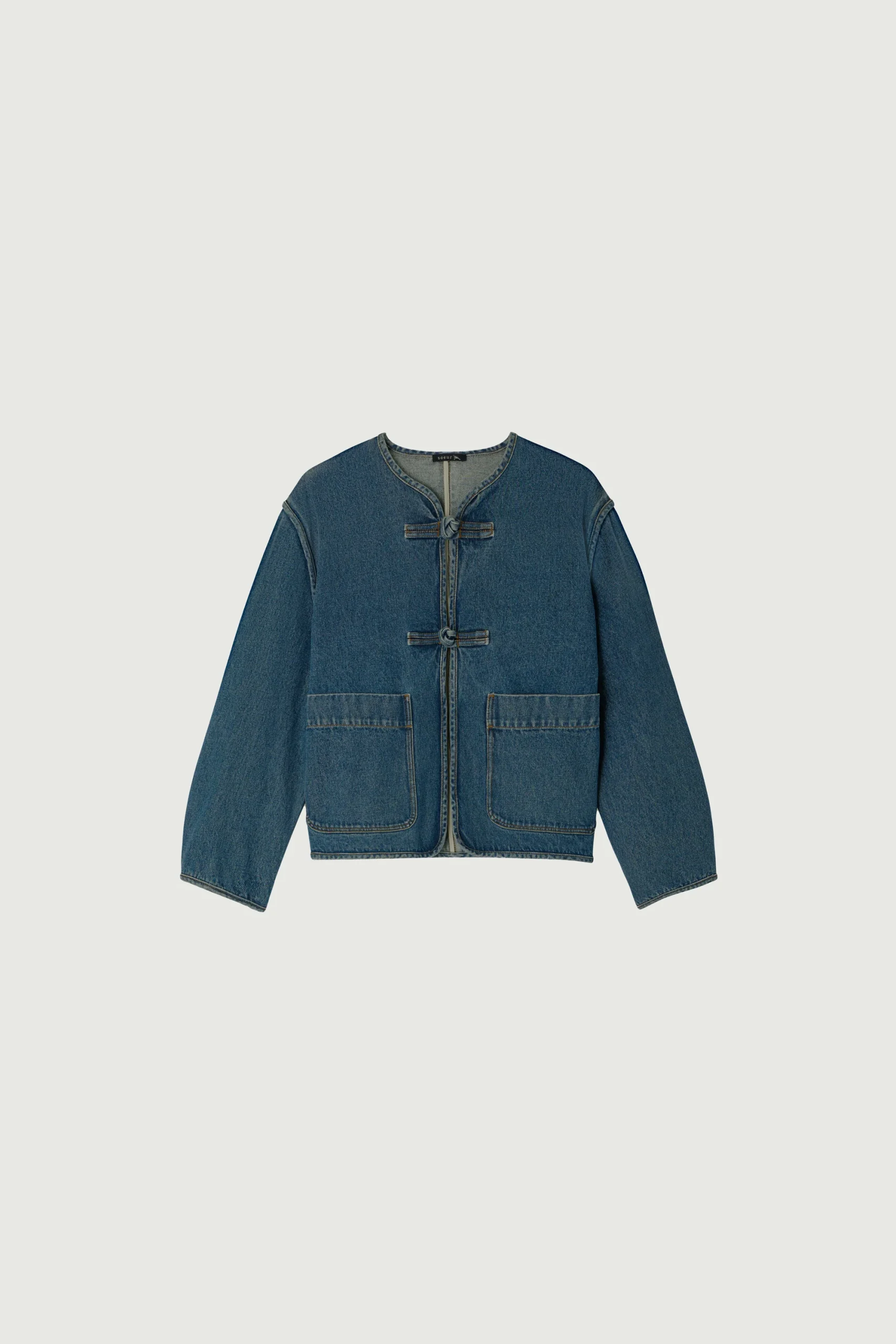 AGATHA es una chaqueta de tela vaquera gruesa, suavizada gracias a un lavado que conserva su intenso color azul índigo. Su corte sin forro es cuadrado y corto. Sus brandeburgos (cierres con lazos) y sus acabados ribeteados son detalles inspirados en la ropa de oficial.