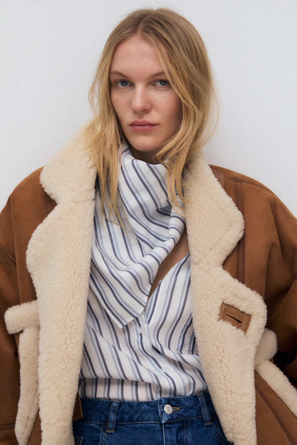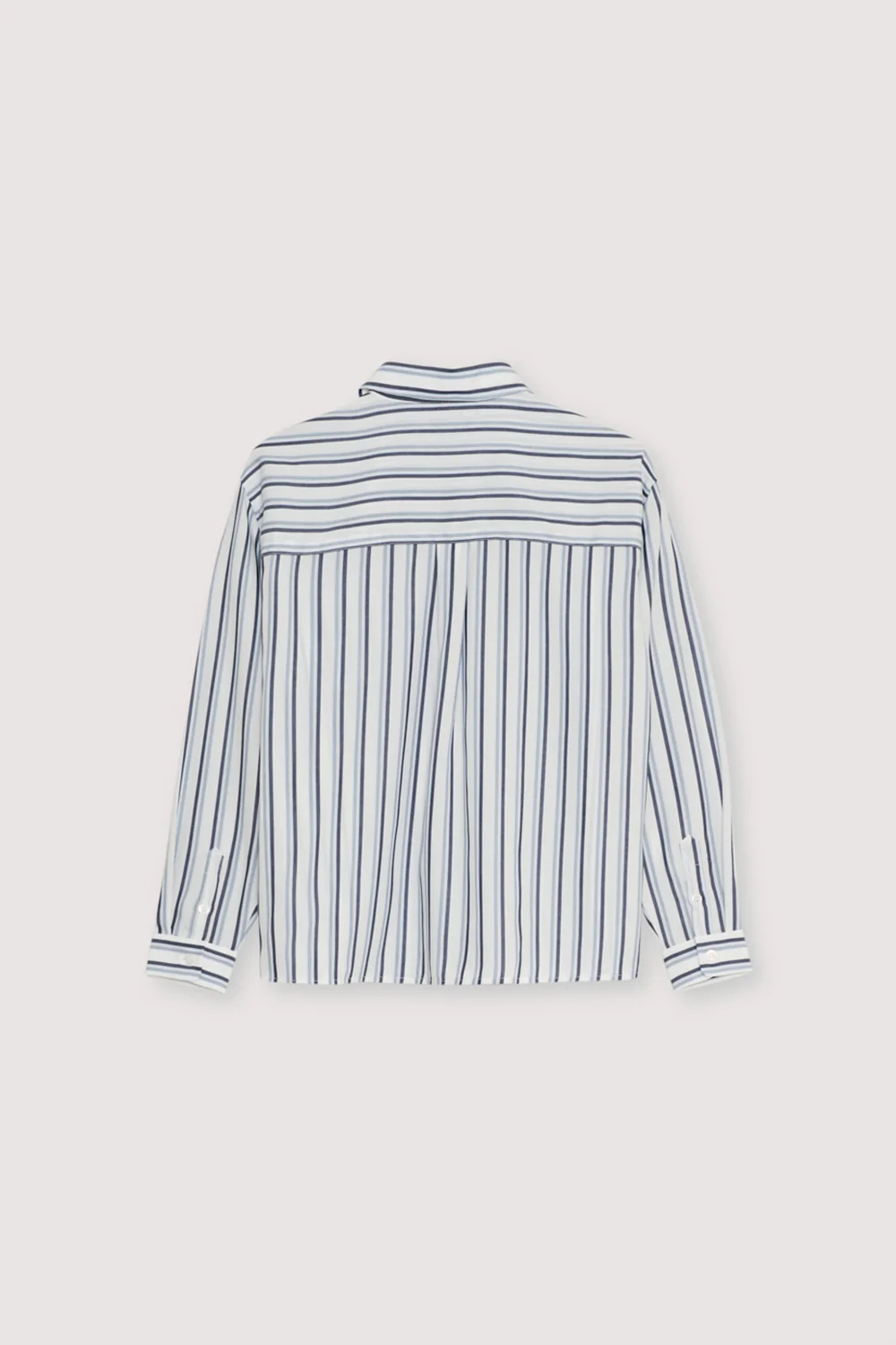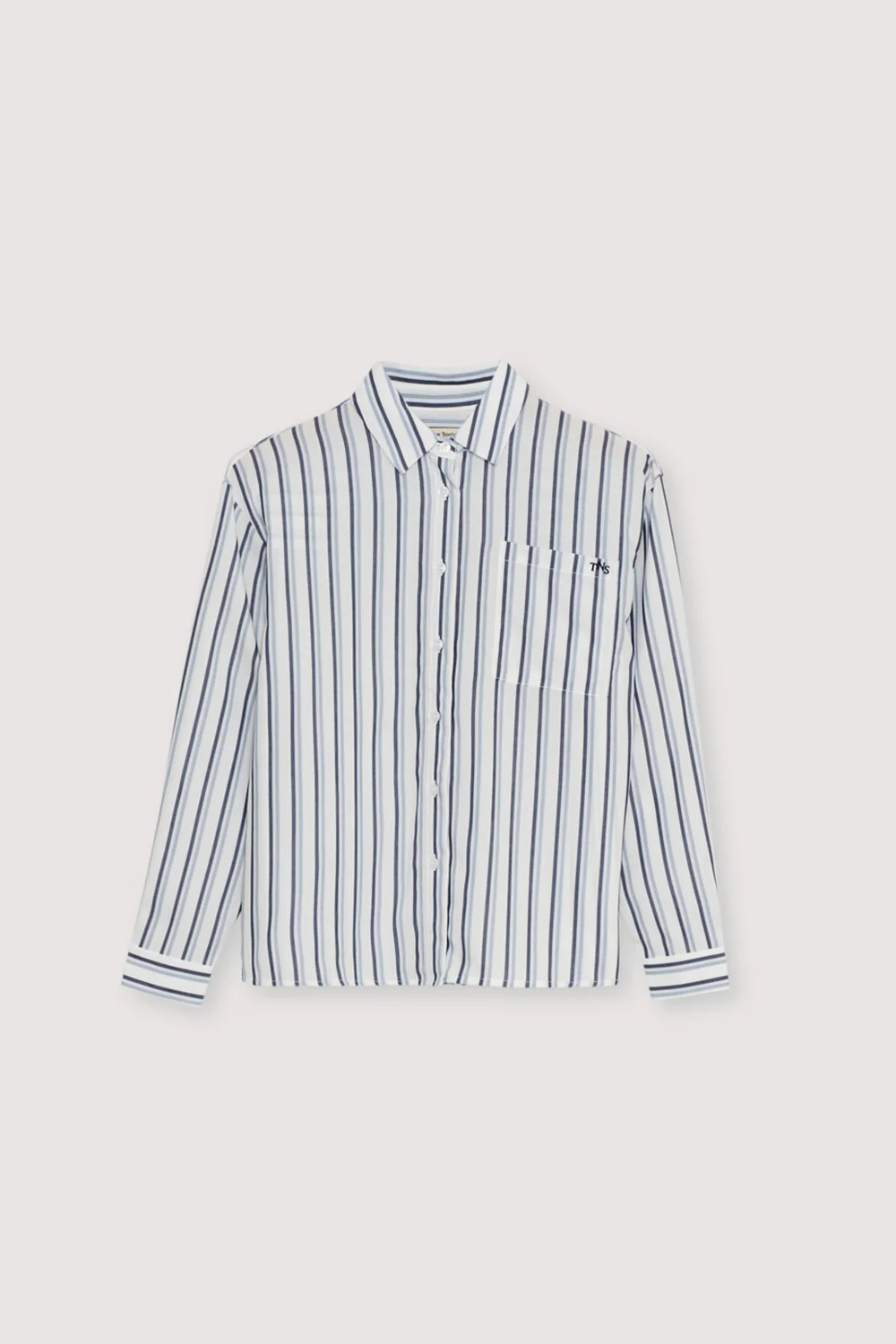 Camisa de rayas Tencel en suaves tonos azulados, diseñada con abertura de botón tonal y puños para un acabado refinado. Cuenta con un bolsillo frontal de parche y viene con una bufanda a juego en el mismo tejido ligero para un estilo versátil.
