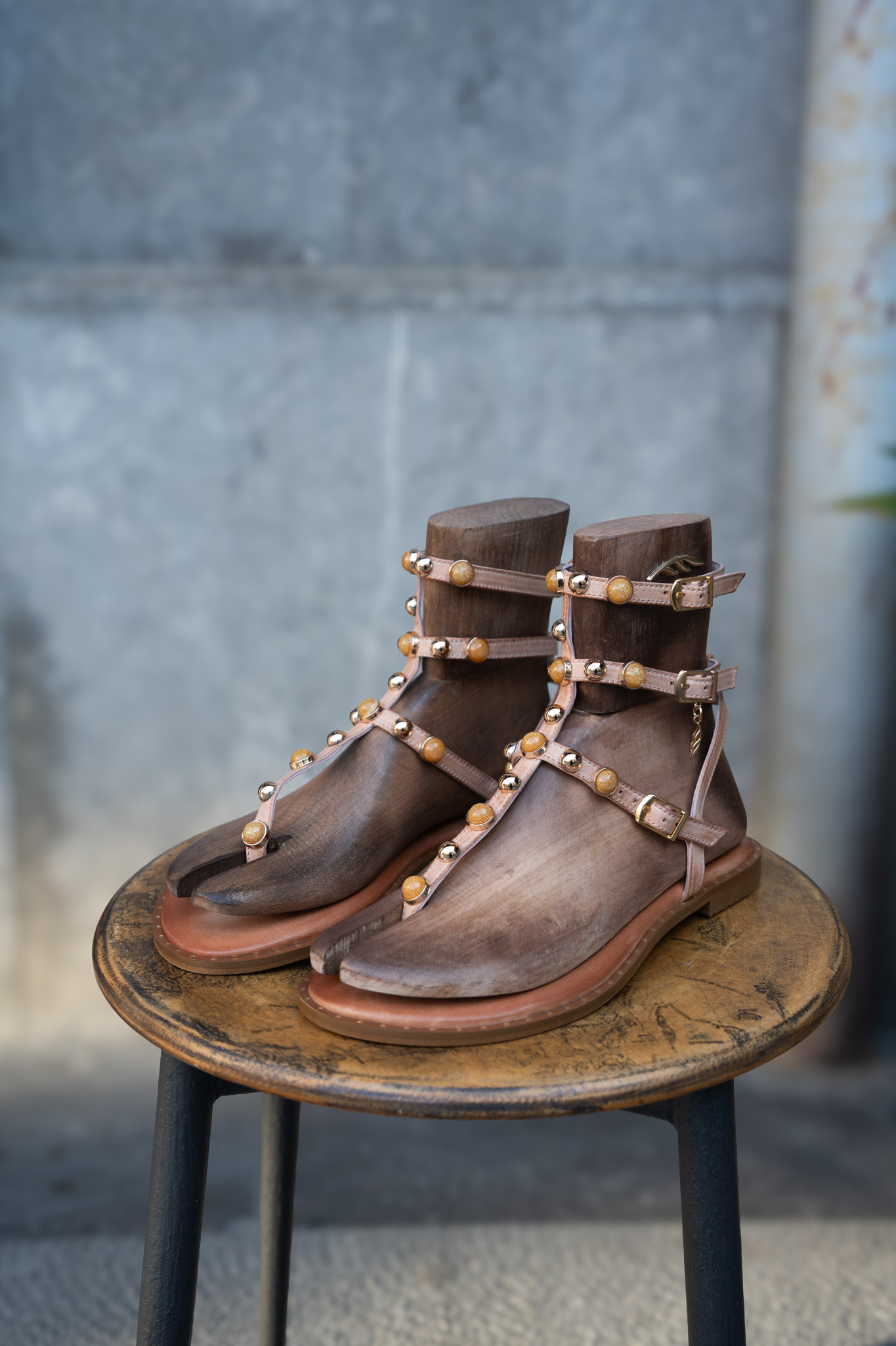 Sandalia plana de inspiración romana en tono nude, con tiras finas que envuelven el pie y el tobillo, creando una silueta elegante y femenina. Destaca por sus detalles dorados tipo joya, que aportan luz y un toque sofisticado.