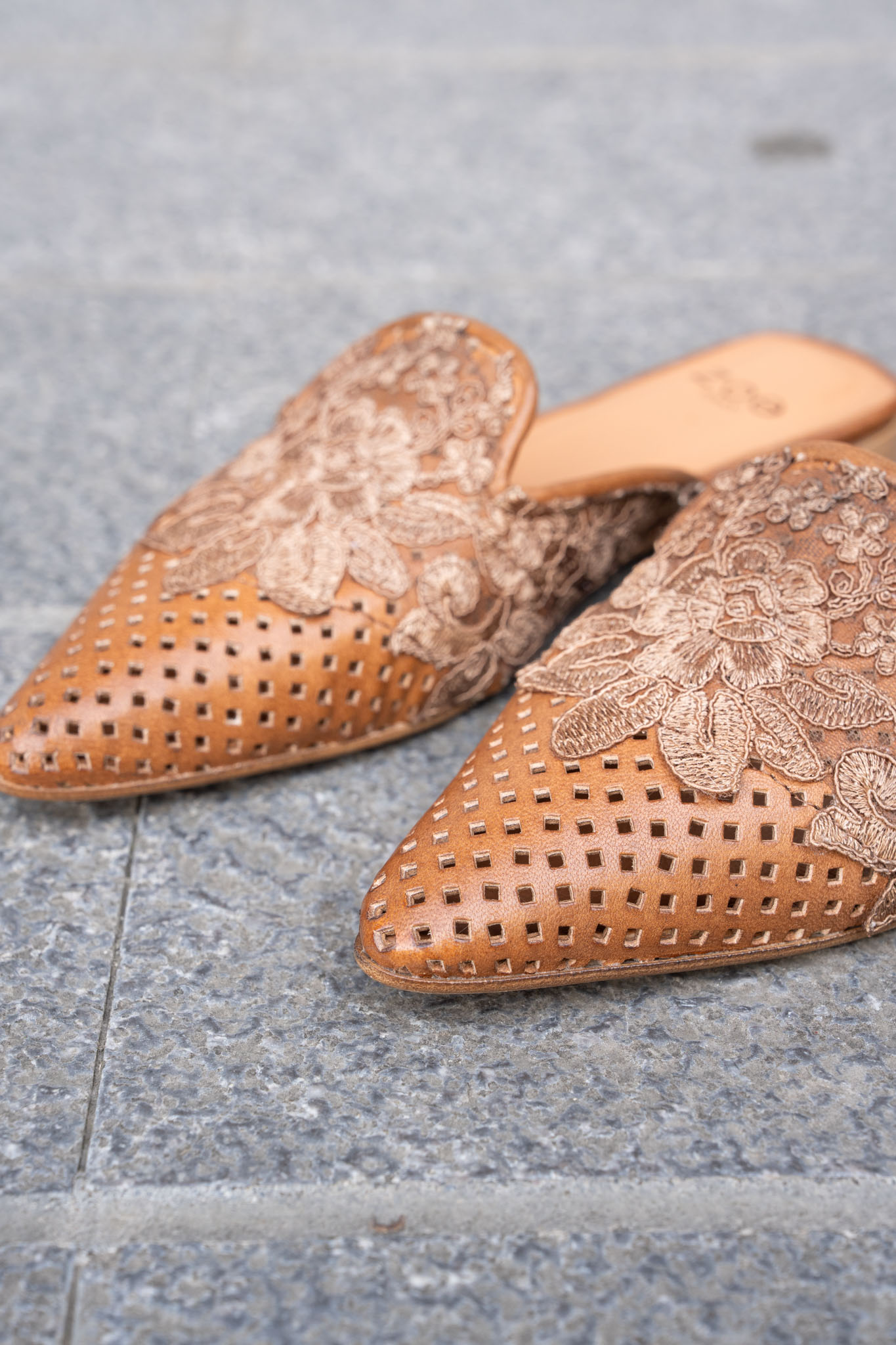 Zueco tipo mule en piel color cuero con delicado bordado floral en relieve que aporta un toque artesanal y elegante. La parte delantera calada permite una mayor transpiración y lo convierte en un calzado perfecto para los días más cálidos.